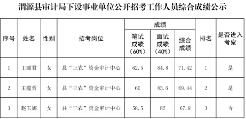 2022年公开选调渭源县审计局下设事业单位工作人员工作,经过报名、笔试、面试等环节,根据《2022年公开选调渭源县审计局下设事业单位工作人员方案》规定,按1:1.5的比例,确定考察对象并进行全面考察。根据综合成绩和考察情况,提出拟选调对象王丽君等2名同志为考察人员,现进行公示,接受广大干部群众监督。如发现有违纪违法、违反廉洁自律方面的行为或不符合选调条件等影响选调的,可通过电话、来信、面谈等形式反映,我们将认真受理,并向署名或当面反映问题的干部群众反馈调查核实结果。 公示时间:2022年7月25日至2021年7月29日,公示期为5个工作日。 受理部门:渭源县审计局(511室) 受理时间:上午8:30-12:00,下午14:30-18:00 受理电话:0932—41321790932—4132145  渭源县人力资源和社会保障局 渭源县审计局 2022年7月25日