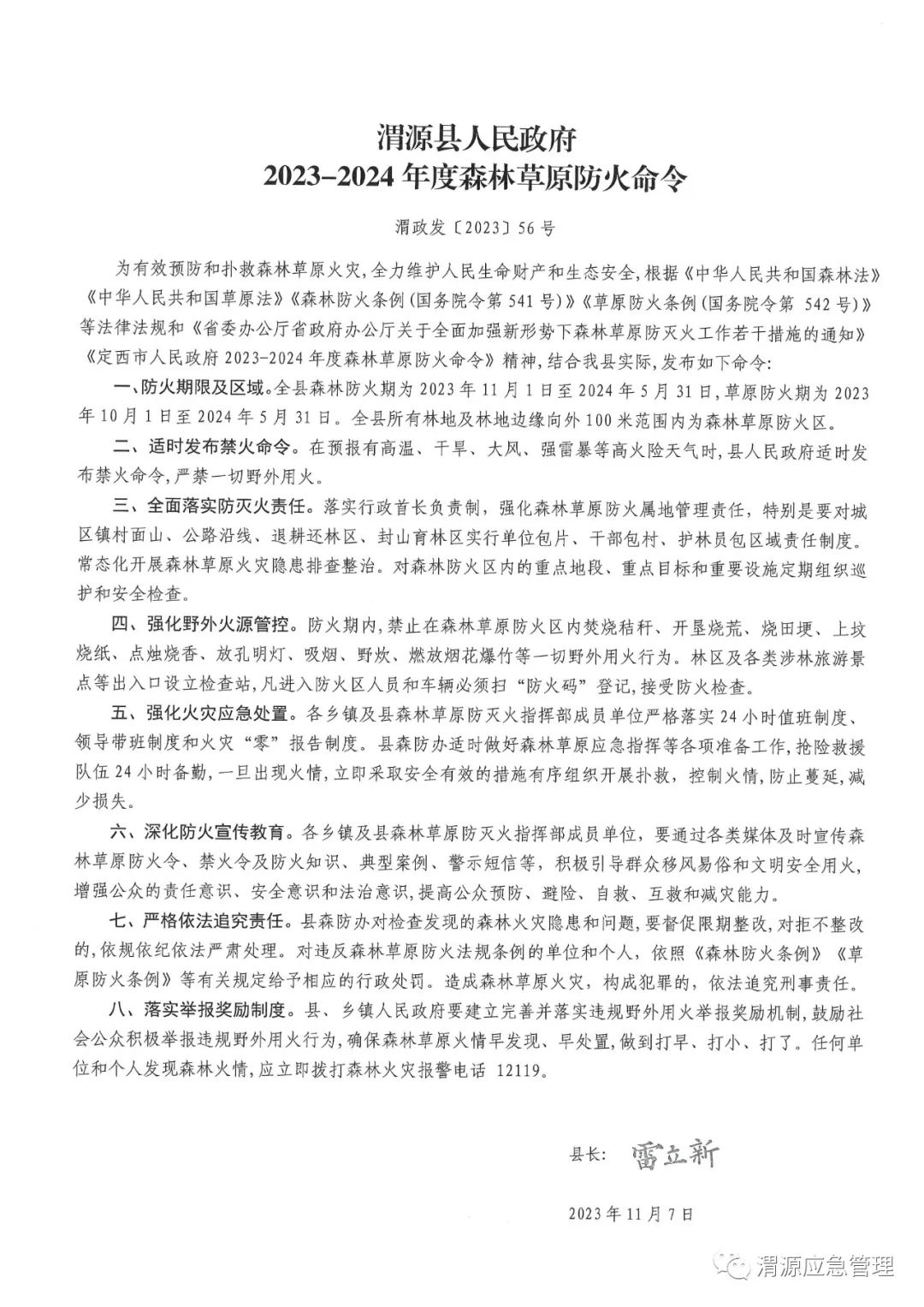 渭源县人民政府2023—2024年度森林草原防火命令