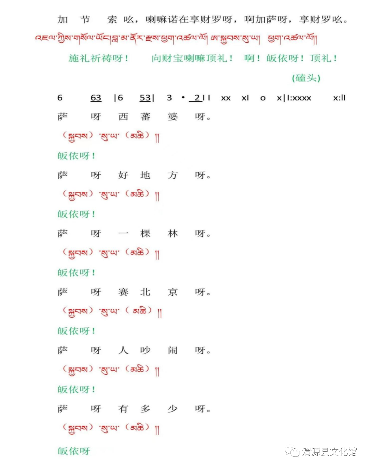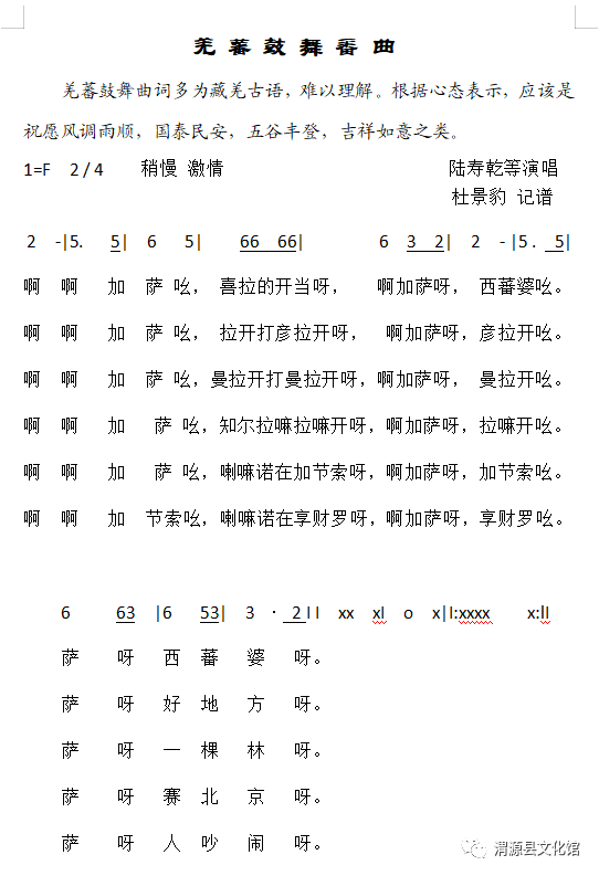 2020年以来,渭源县文化馆再次对“羌蕃鼓舞”这一珍贵非遗进行了深入系统的研究挖掘和整理,并寻求这一文化密码的破译。2023年,西北民族大学杨士宏到渭源县文化馆考察走访,与馆负责人就汉藏语言、民族文化融合等进行了深入交流。 杨士宏先生是藏族,甘肃省文史馆馆员,从事民族学、藏族地方历史、方言及传统文化研究。尤其欣喜的是,杨教授出生在与渭源山水相连的卓尼县。卓尼与渭源南部峡城、会川、麻家集等地在历史上,几乎一直归属同一行政管辖,山水相连,语言相通,风俗相近。杨教授对民族融合有深的研究,精通藏语与汉语体系,出版发行或发表了《甘肃洮州卓逊杨土司简传》《一河两江流藏语方言汇要》《白马藏语方言词典》《卓尼土司历史文化》《藏族传统法律文化研究》《中国少数民族宗教艺术教程》《安木多藏区东部历史文化研究》《蒙藏传统法律文化比较研究》等多部专著和学术论文,主持完成教育部社科规划项目《白马藏族语料库建设及其族属研究》,国家社科基金项目《白马藏语数据库建设及与藏语书面语比较研究》等一系列重大研究项目。 文化馆紧紧抓住这一机遇积极衔接,经杨士宏先生反复研究考证,终于有了重大突破,将其破译。这一发现,对于研究“羌蕃鼓舞”这一非物质文化遗产和民族交往、交流、交融载体的文化价值和意义,起到了极大的推动作用。