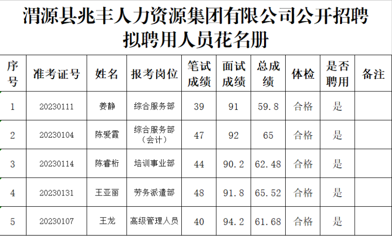 渭源县兆丰人力资源集团有限公司公开招聘工作人员,经过报名、笔试、面试、体检等环节,拟聘用姜静、陈爱霞、陈睿桁、王亚丽、王龙5名同志为工作人员,现进行公示,接受广大群众监督。如发现有违纪违法或不符合招聘条件等影响聘用的,可通过电话、来信、面谈等形式反映,我们将认真受理,并向署名或当面反映问题的群众反馈调查核实结果。 公示时间:2023年12月11日至2023年12月15日,公示期为5个工作日。 受理时间:上午8:30-12:00,下午14:30-18:00 受理电话:渭源县劳务服务中心 0932—4132294 渭源县兆丰人力资源集团有限公司 18009325229