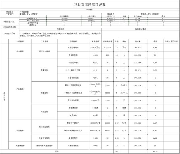 (二)村干部报酬绩效自评情况: 根据年初设定的绩效目标,项目绩效自评得分为95.57分。 1.总体绩效目标完成情况:该项目预算批复金额为100.5万元,完成支付91.52万元,使用效率为91.06%,项目支出控制在批复的预算范围内。 2.绩效指标完成情况,通过对全乡10个村31名村干部发放报酬,发放91.52万元,产出指标完成91.06%;提升村干部工作积极性,增加村干部收入,提高村干部满意度。 3.发现的主要问题及原因:主要问题是村干部报酬支出未完成;原因是村干部报酬按照绩效考核,报酬次月发放,故资金执行率未达到100%。 4.下一步改进措施:建立健全绩效考核管理制度,确保工资按月及时发放。 村干部报酬绩效自评情况:
