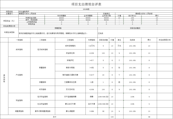 (六)村社道路养护绩效自评情况: 根据年初设定的绩效目标,项目绩效自评得分为98分。 1.总体绩效目标完成情况:项目全年预算数为5万元,执行数为5万元,完成预算的100%,项目支出控制在批复的预算范围内。 2.绩效指标完成情况:村社道路养护资金主要用于大安乡10个村村社道路维修养护及交管站的正常运转,确保村社道路及时维修,为人民群众出行提供便利。 3.偏离绩效目标的原因和下一步改进措施:该项目资金为5万元,全部完成支付,无偏离绩效目标情况。 村社道路养护绩效自评情况: