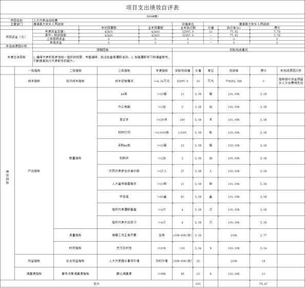 (五)人大代表活动经费绩效自评情况: 根据年初设定的绩效目标,项目绩效自评得分为75.47分。 1.总体绩效目标完成情况:项目全年预算数为4.24万元,执行数为3.29万元,完成预算的77.82%,项目支出控制在批复的预算范围内。 2.绩效指标完成情况:人大代表活动经费主要用于人大代表组织活动、人大办公室办公用品购买、人大宣传版面制作以及打印机墨粉、购买A4纸等支出;提高人民群众及人大代表满意度,更好地为群众建言献策。 3.发现的主要问题及原因:主要问题是人大代表活动经费全部未支出;主要原因是一些办公用品采购费用从2024年人大考核奖励资金中支出,故本年度预算资金使用率不高。 4.下一步改进措施:提高预算编制的准确性。 人大代表活动经费绩效自评情况:
