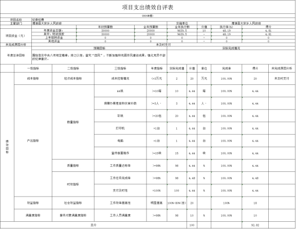 (七)纪委经费绩效自评情况: 根据年初设定的绩效目标,项目绩效自评得分为92.82分。 1.总体绩效目标完成情况:该项目预算批复金额为2万元,实际支出金额为9639.5元,使用效率为48.19%,项目支出控制在批复的预算范围内。 2.绩效指标完成情况:通过党风廉政宣传彩页、办公用品购置等支出,对产出指标完成48.19%。确保工作高质量完成,纪委工作正常开展,对效益指标全面完成。对各类“四风”问题坚持快查快结,通报曝光,提高人民群众满意度。 3.发现的主要问题及原因:主要问题是纪委经费未全部支出,预算执行率低;原因是预算执行过程中增加了中央政法纪检监察转移支付资金,一些办公用品等支出从此项资金中支出,故本年度预算资金使用率不高。 4.下一步改进措施:我乡将有效提高资金使用率,及时支付资金,确保资金专款专用,提高预算执行率。 纪委经费绩效自评情况: