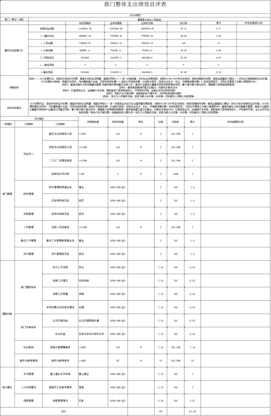 单位整体支出绩效自评分析 1.单位决算情况 2024年度一般公共预算财政拨款支出1269.78万元,收入1269.78。(1)基本支出775.59万元。其中:工资福利支出700.2万元,占总支出的55.14%;商品和服务支出75.39万元,占总支出的5.93%。(2)项目支出494.19万元。其中:商品和服务支出118.15万元,占项目支出的23.9%;对个人和家庭的补助190.8,占项目支出的38.6%;资本性支出185.24万元,占项目支出的37.48%。 2.总体绩效目标完成情况 绩效目标总体完成情况良好,项目自评得分93.46分,评价等级为“良”。 3.各项指标完成情况分析 各项指标均按照年初既定绩效完成阶段性目标任务,实现预期效果。 4.偏离绩效目标的原因及下一步改进措施 不存在偏离绩效目标的情况。下一步我单位将继续建立健全财务管理制度并严格遵守执行。