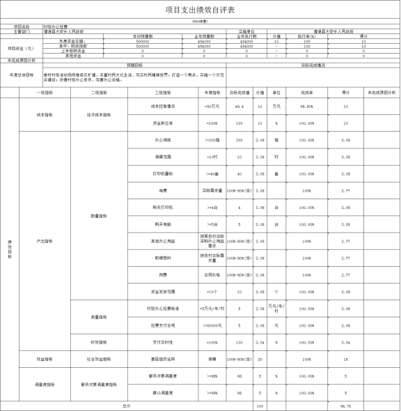 (四)村级办公经费绩效自评情况: 根据年初设定的绩效目标,项目绩效自评得分为96.76分。 1.总体绩效目标完成情况:该项目预算批复金额为49.4万元,实际支出金额49.4万元,使用效率为100%,项目支出控制在批复的预算范围内,全部完成支付,无偏离绩效目标情况。 2.绩效指标完成情况:该项目主要用于保障村级办公支出,对效益指标全面完成,改善村级办公条件、完善办公设施,切实能够为群众办理更多公益性事项,提升基层治理能力,提高人民群众满意度。 3.偏离绩效目标的原因和下一步改进措施:该项目资金全部完成支付,无偏离绩效目标情况。 村级办公经费绩效自评情况: