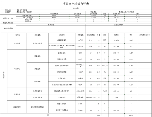 单位预算项目支出绩效自评分析 我单位在2024年度部门决算中反映监委会主任报酬、村干部报酬、社干部报酬、村级办公经费、人大代表活动经费、村社道路养护、纪委经费、农财员补助等8个项目绩效自评结果。 (一)监委会主任报酬绩效自评情况: 根据年初设定的绩效目标,项目绩效自评得分为92.34分。 1.总体绩效目标完成情况:该项目预算批复金额为9万元,实际支出金额为8.25万元,使用效率为91.67%,项目支出控制在批复的预算范围内。 2.绩效指标完成情况:通过对全乡10个村10名村监委主任发放报酬,指标完成100%。确保村监委工作高质量完成,对效益指标全面完成;提升村监委主任工作积极性,增加收入,提高监委主任满意度。 3.发现的主要问题及原因:主要问题是监委会主任报酬支出未完成;原因是监委会报酬按照绩效考核,实行次月发放,故资金执行率未达到100%。 4.下一步改进措施:建立健全绩效管理机制,确保报酬按月及时发放。 监委会主任项目绩效自评情况: