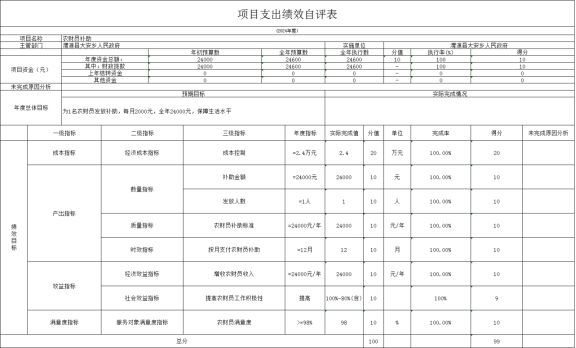 (八)农财员补助绩效自评情况: 根据年初设定的绩效目标,项目绩效自评得分为99分。 1.总体绩效目标完成情况:该项目预算批复金额为2.46万元,对1名农财员按时发放补助,实际支出金额为2.46万元,使用效率为100%,项目支出控制在批复的预算范围内。 2.绩效指标完成情况:增加了农财员收入,确保农财员工作高质量完成,对效益指标全面完成。提升农财员工作积极性,增加农财员收入,提高其满意度。 3.农财员补助绩效自评情况:
