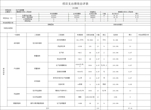 (三)社干部报酬绩效自评情况: 根据年初设定的绩效目标,项目绩效自评得分为97.24分。 1.总体绩效目标完成情况:该项目预算批复金额为61.2万元,实际支出金额为55.83万元,使用效率为91.23%,项目支出控制在批复的预算范围内; 2.绩效指标完成情况:通过对全乡68个社社长发放报酬,指标完成91.23%,确保了社长工作高质量完成,提升社长工作积极性。 3.发现的主要问题及原因:主要问题是社干部报酬支出未完成;原因是社干部报酬按照绩效考核,实行次月发放,故资金执行率未达到100%。 4.下一步改进措施:建立健全绩效考核管理制度确保工资按月及时发放。 社干部报酬绩效自评情况: