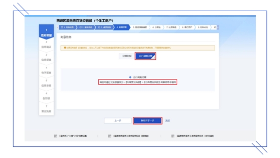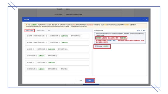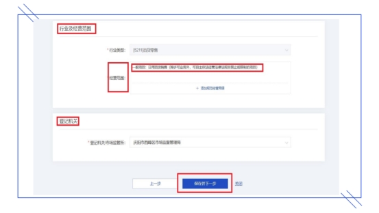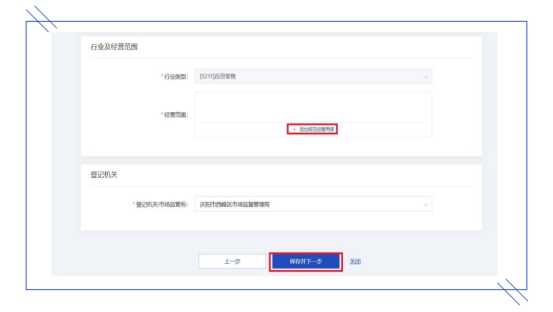13.在行业及经营范围中出现的全部经营范围则会显现在营业执照中,确认无误,点击“保存并下一步”。