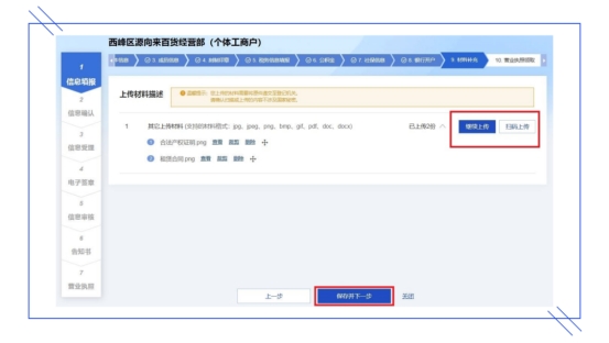 23.确认上传的材料完整、清晰、无误,点击“保存并下一步”。
