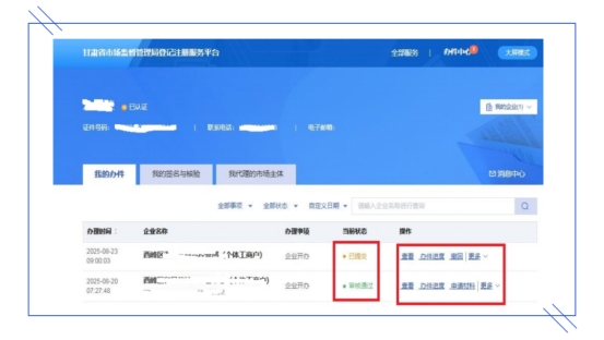 29.在“办件中心”,可随时查看办理结果及状态,代理人的手机也会同步收到各办理环节的提醒短信。当前状态显示“审核通过”,则可通过微信或支付宝的“电子营业执照”小程序下载“电子营业执照”(电子营业执照与纸质营业执照有同等法律效力)。