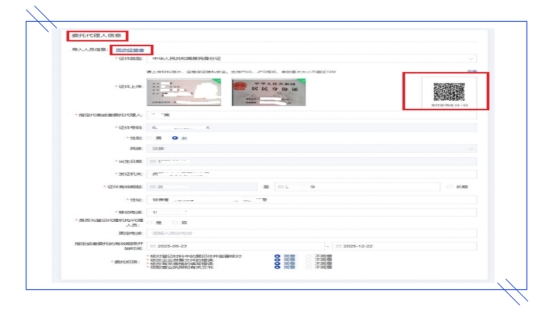 15.在“委托代理人信息"页面,导入、用微信或支付宝扫码上传委托代理人的身份证件正面及反面,此处确保上传的证件工整、清晰可见,并确认信息识别无误。(若代理机构工作人员,请一定选择代理机构,否则将会因风险过高而被驳回)