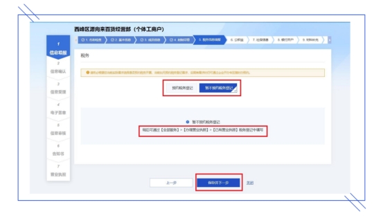 18.在“税务信息填报”页,选择“暂不预约税务登记”(此处申请人即可选择“预约税务登记”,也可选择“暂不预约税务登记”),点击“保存并下一步”。