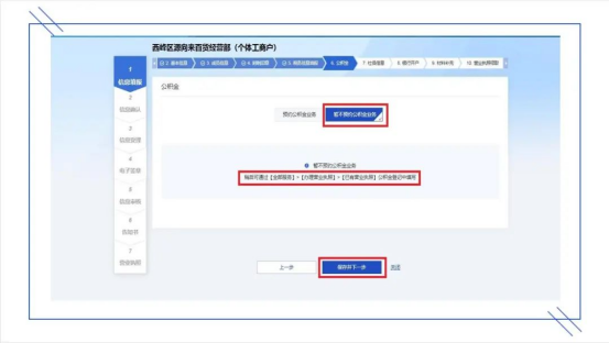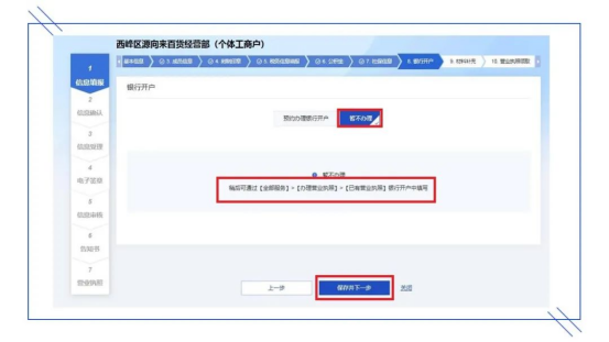 21.在“银行开户”页,选择“暂不办理”(此处申请人即可选择“预约办理银行开户”,也可选择“暂不办理”),点击“保存并下一步”。