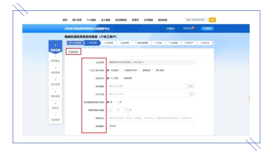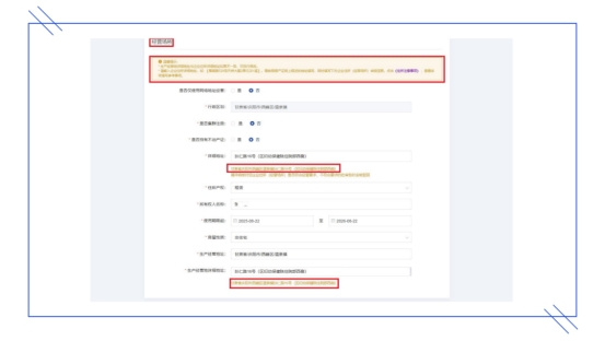 10.填写“经营场所”信息,在“详细地址”中,不填写行政区划,只填写**路、**小区、**楼栋、**单元室等字样(生成的经营场所信息会完整的显示在详细地址的下方第一行,请确认行政区划等有无重复)。