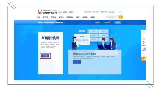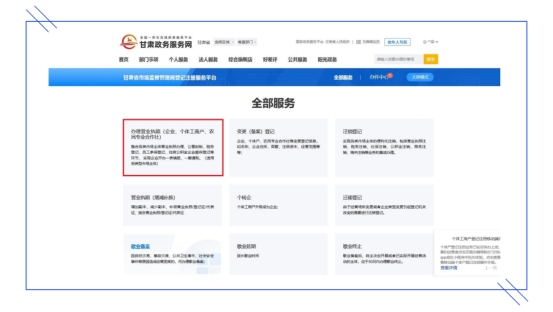 3.在“甘肃省市场监督管理局登记注册服务平台”的“全部服务”页面选择“办理营业执照”。