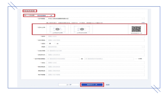 16.在“联络员信息”页面,导入、用微信或支付宝扫码上传联络员的身份证件正面及反面,此处确保上传的证件工整、清晰可见,并确认信息识别无误。点击“保存并下一步”。
