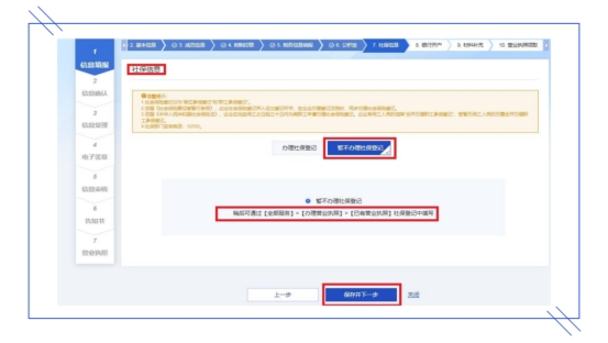 20.在“社保信息”页,选择“暂不办理社保登记”(此处申请人即可选择“办理社保登记”,也可选择“暂不办理社保登记”),点击“保存并下一步”。