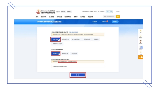 6.申请人根据需要选择要办理的“市场主体类型”(要对市场主体类型做进一步了解,请打开第一行“市场主体类型说明”查看);这里小编选择“个体工商户”--“我没有名称”(小编希望店铺有自己的门头招牌,为店铺起一个响亮的名称字号,所以选择“我没有名称”,建议大家也在初办执照时选择“我没有名称”);选择办理的个体户营业地点在哪里?仅需选择到乡镇街道办即可,后续再填写详细地址。(注:填写完成后发现需修改乡镇街道办名称的,须从本步重新开始填写)点击“下一步”。