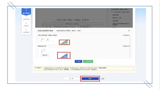 26.显示须对“申请材料完成在线签名”的人员姓名及需要“身份认证”的人员姓名,点击“立即签名”,签名人员用微信或支付宝扫码,也可通过手机短信上收到的签名通知链接,完成对申请材料的确认签名。点击“实名认证”,需身份认证的人员使用支付宝扫码或搜索“登记注册身份验证小程序”完成身份验证。(选择扫码的,则需对申请材料及身份认证分别扫码,才能完成对申请材料的确认签名及身份认证)