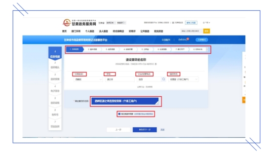 7.填写“名称检查”页,店铺名称由行政区划、字号、行业/经营特点、组织形式四部分组成。(注:填写字号必须慎重,不得与驰名商标等近似或重名,也不得违反企业名称登记管理规定等法律法规),我已“阅读并同意”《名称登记自主申报须知》,“保存并下一步”。
