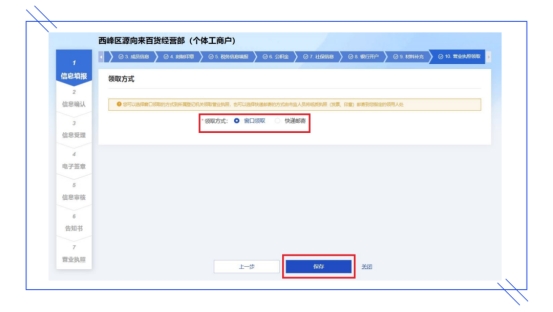 24.领取方式选择窗口领取(申请人即可“窗口领取”,也可“快递邮寄”),点击“保存”。