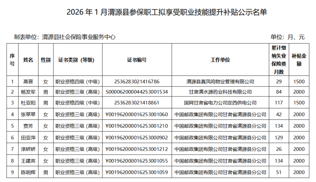 根据甘肃省人力资源和社会保障厅、甘肃省财政厅、国家税务总局甘肃省税务局《关于做好失业保险稳岗惠民政策落实工作的通知》(甘人社通〔2025〕166号)和甘肃省人力资源和社会保障厅、甘肃省财政厅《关于失业保险支持参保职工提升职业技能有关问题的通知》(甘人社通〔2017〕275号)文件精神,现将渭源县社保中心2026年1月份受理的参保职工拟享受职业技能提升补贴名单(共9人)予以公示,公示期限为5个工作日,欢迎社会各界监督。如发现有影响公示对象享受职业技能提升补贴的问题,可在公示期内,通过电话、来信、面谈等形式反映,我中心将认真受理,并进行调查核实,反映问题须用本人真实姓名。如不存在影响享受职业技能提升补贴的问题,我中心将按有关规定办理补贴发放手续。 一、公示时间 2026年1月19日—2026年1月23日 二、受理反映情况单位及监督电话 受理部门:渭源县社保中心(企业职工养老工伤失业保险股) 联系电话:0932-4133516 通讯地址:渭源县清源镇新街1号(渭源县社保中心301室)