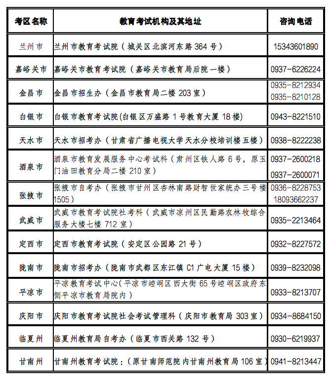 附件4 甘肃省各市(州)教育考试招生机构地址及联系电话