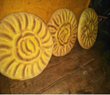 花炕子馍馍的用料:做得不多的时候,发酵面500克、鸡蛋1只、食用油5勺、白糖三勺、小苏打适量,面粉1碗。但在农村过年时,一般每户人家都要做很多,于是做馍馍前一晚和好一大一盆面,用一个晚上的时间,醒好了面,第二天家里会叫来邻居帮忙揉面,这真是门手艺活。第二个步骤是孩子们最喜欢的,拿着镊子给它添上花。我想这也是之所以叫它“花炕子”最好的解释,当然大人们会嫌弃孩子们做得太丑。最后上火烤,做法真是独特,味道也因此出名,渭源人的餐桌少不了它的身影。刚出锅时,冒着热气,外焦里嫩,擦些油的话颜色就更好,足足是一个个金黄色的大饼,让人馋涎欲滴!