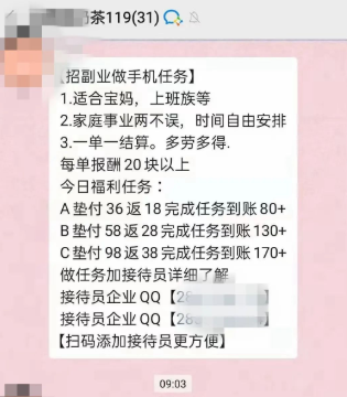 打着“日赚三百”的幌子开展刷单,群里有专门的派单员,客服发送刷单任务和报酬,这种看似很赚钱的“刷单”,十分受家庭主妇、大学生青睐,殊不知,为了少量的佣金,却把大额的本金搭进去了!