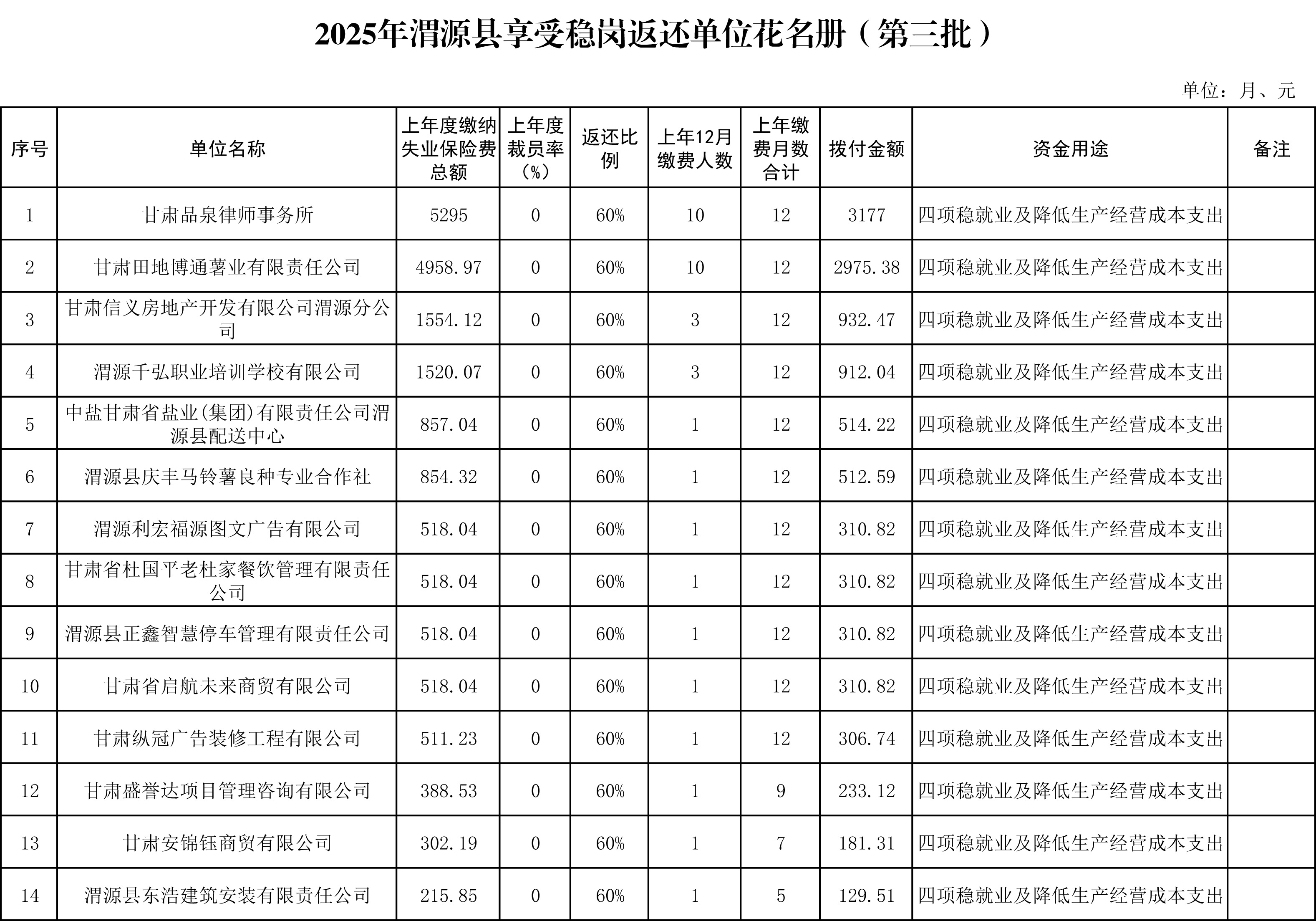 为贯彻落实《甘肃省人力资源和社会保障厅 甘肃省财政厅 国家税务总局甘肃省税务局关于做好失业保险稳岗惠民政策落实工作的通知》(甘人社通〔2025〕166号)精神,现对渭源县2025年拟享受失业保险稳岗返还14家单位予以公示。公示期限为5个工作日,欢迎社会各界监督。如发现不符合实际情况和政策规定的问题,可在公示期内,通过电话、来信、面谈等形式反映,反映问题须用本人或本单位真实名称,我们将认真受理,并向署名或当面反映问题的群众和单位反馈核实情况。如不存在影响享受稳岗返还政策的问题,我们将按照规定办理发放手续。 公示时间:2025年9月12日——2025年9月18日(共5个工作日)。 受理时间:上午8:30--12:00 下午14:30--18:00(工作日) 受理部门:渭源县社会保险事业服务中心 联系电话:0932-4133516 通讯地址:渭源县社会保险事业服务中心301室 附件:渭源县2025年享受稳岗返还单位花名册(第三批)